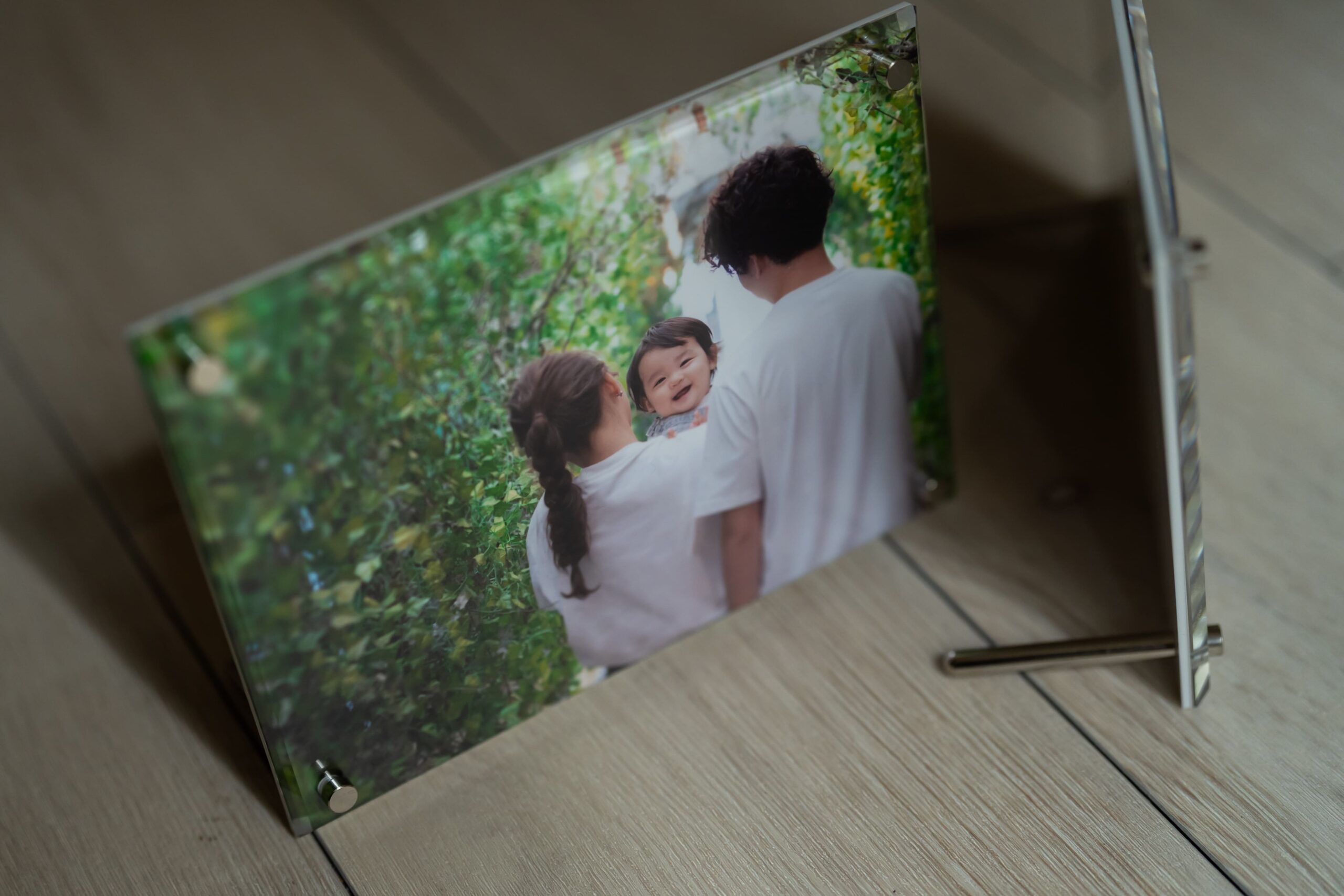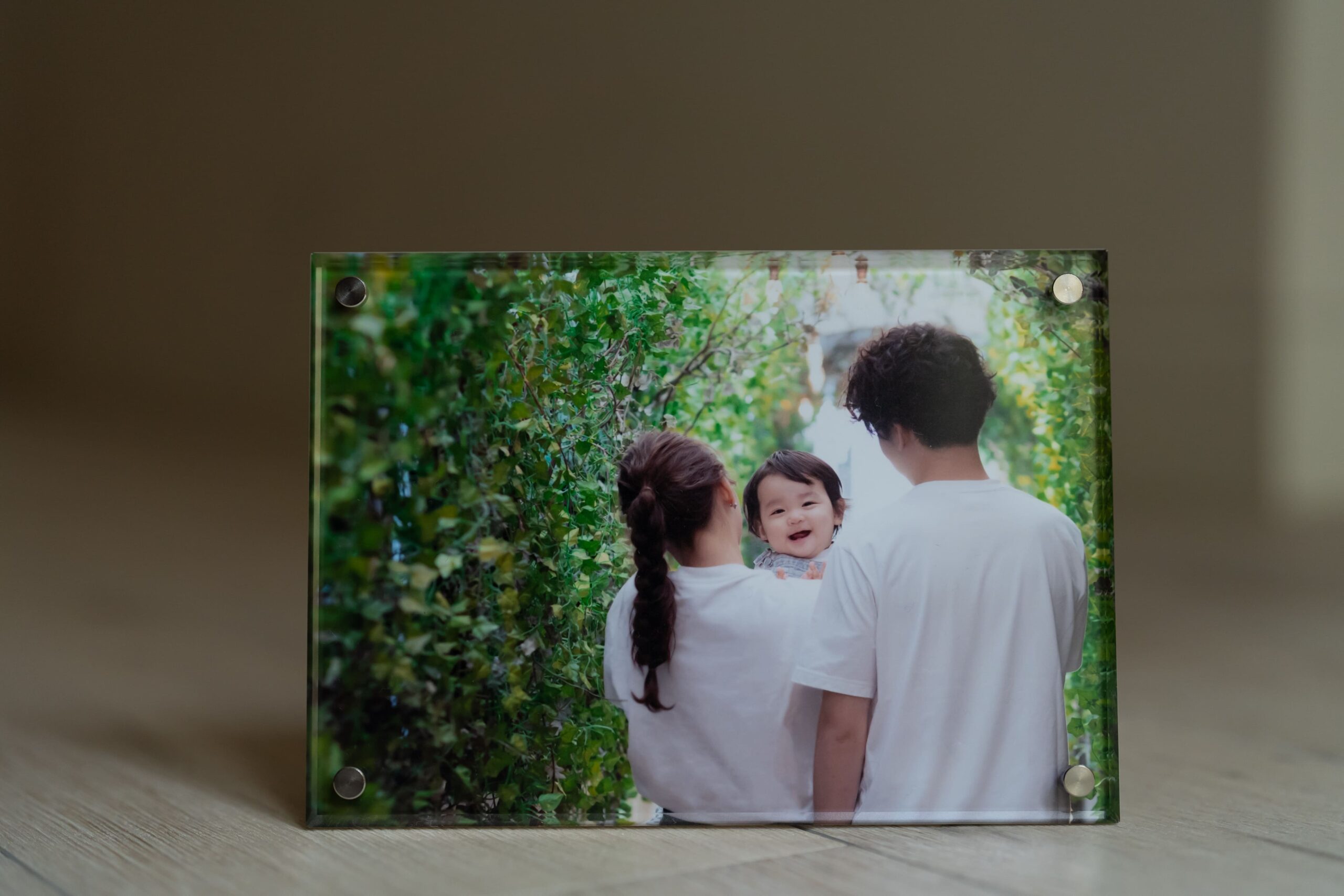 お写真をアクリル板ではさんだフォトグッズです。透明度が高く高級感があり、立てることも壁にかけることも可能な2way仕様。お気に入りの一枚を厳選して飾りたい方にオススメです。 2Lサイズ127x178mm¥6,600(税抜¥6,000) デザイン例 縦・横どちらでも作成OK! 自立するスタンド付壁掛けも可能な2way仕様です